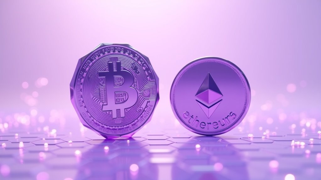 Unlike fiat currencies controlled by central banks, Bitcoin’s monetary policy is hardcoded into its protocol—you get a transparent, predictable supply schedule that no government or institution can alter. Bitcoin’s 21 million coin cap creates permanent asset scarcity; new coins arrive every 10 minutes through mining until 2140. The 2024 halving reduced block rewards to 3.125 BTC, cutting issuance inflation in half. Ethereum, by contrast, has no supply cap. Its monetary policy adjusts dynamically based on network activity and staking rewards. This fundamental difference shapes their economic implications: Bitcoin’s fixed scarcity appeals to those seeking inflation control; Ethereum’s flexible issuance supports protocol sustainability. Understanding these supply dynamics matters when evaluating each asset’s long-term store-of-value potential and deflationary characteristics. Additionally, the next halving in April 2028 will further emphasize Bitcoin’s diminishing rewards and its implications for market behavior.