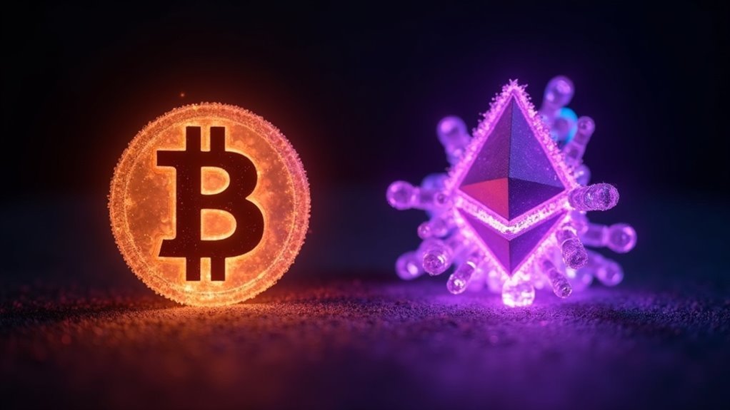 Bitcoin is digital gold for secure value storage with proof-of-work. Ethereum is a decentralized computer for smart contracts using proof-of-stake. Their designs differ completely, from transaction speed and fee models to how they’re governed and scaled. Understanding these contrasts clarifies which one serves your specific need, and there’s much more to unpack about their unique architectures.